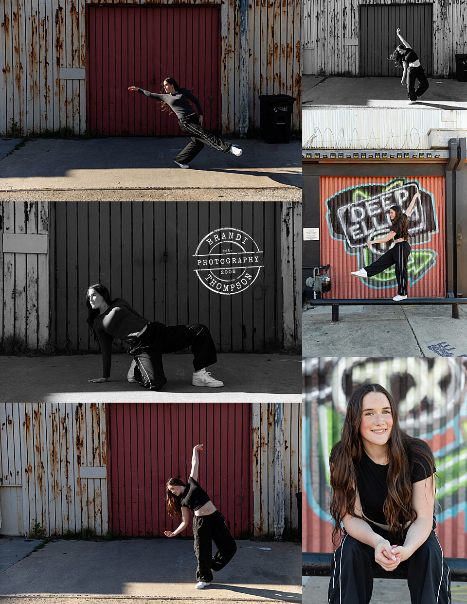 collage of outdoor urban photos with colorful backdrops and a light skinned teen girl doing dance moves in jeans and a sleeveless top - dallas dance photography
